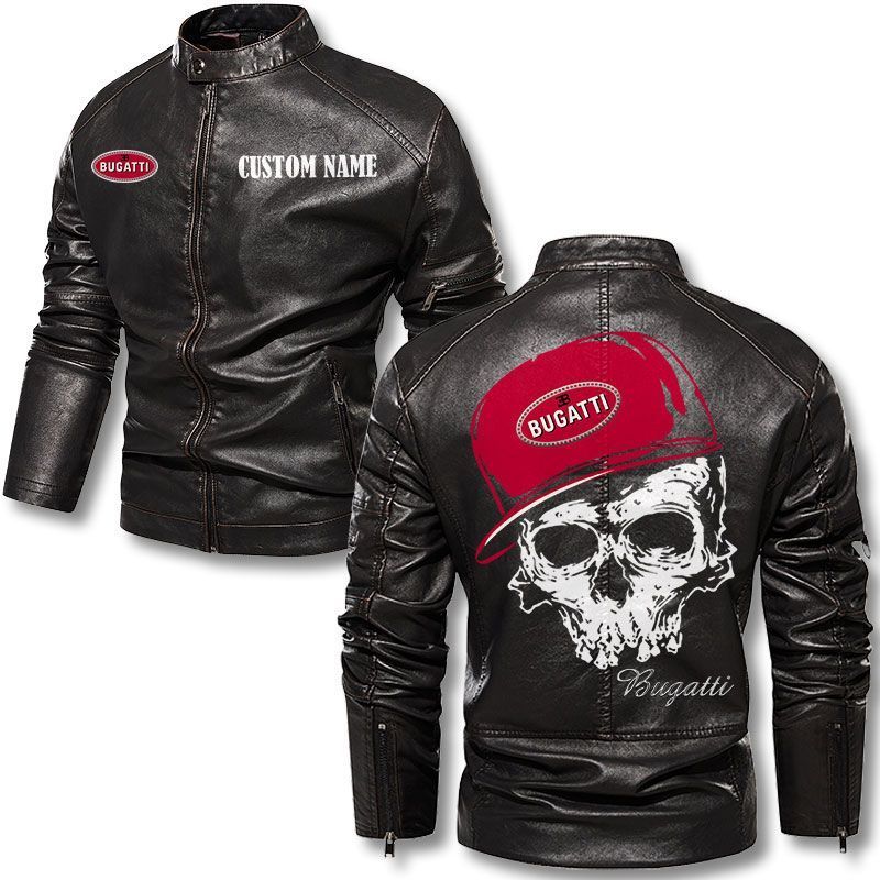 Custom Name Skull Design Bugatti Motorcycle Leather Jacket