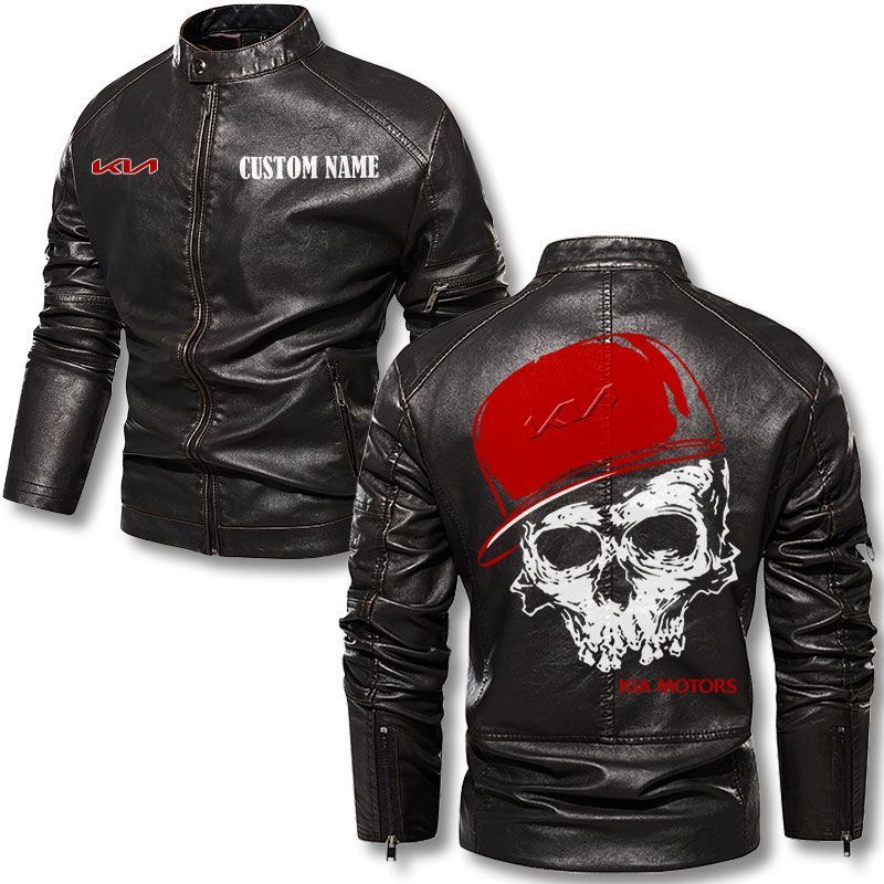 Custom Name Skull Design Kia Motorcycle Leather Jacket