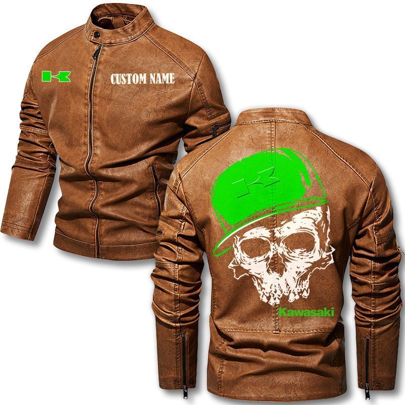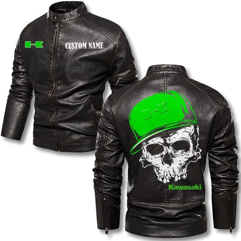 Custom Name Skull Design Kawasaki Motorcycle Leather Jacket