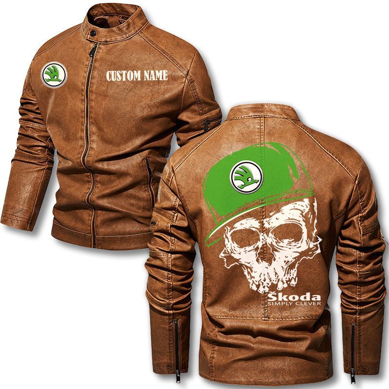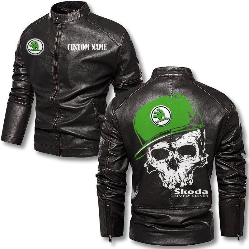 Custom Name Skull Design Skoda Motorcycle Leather Jacket