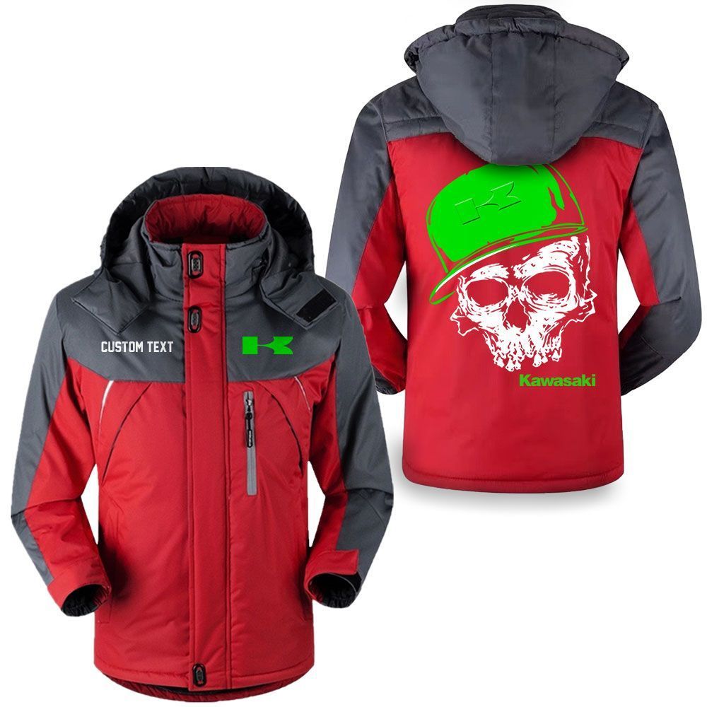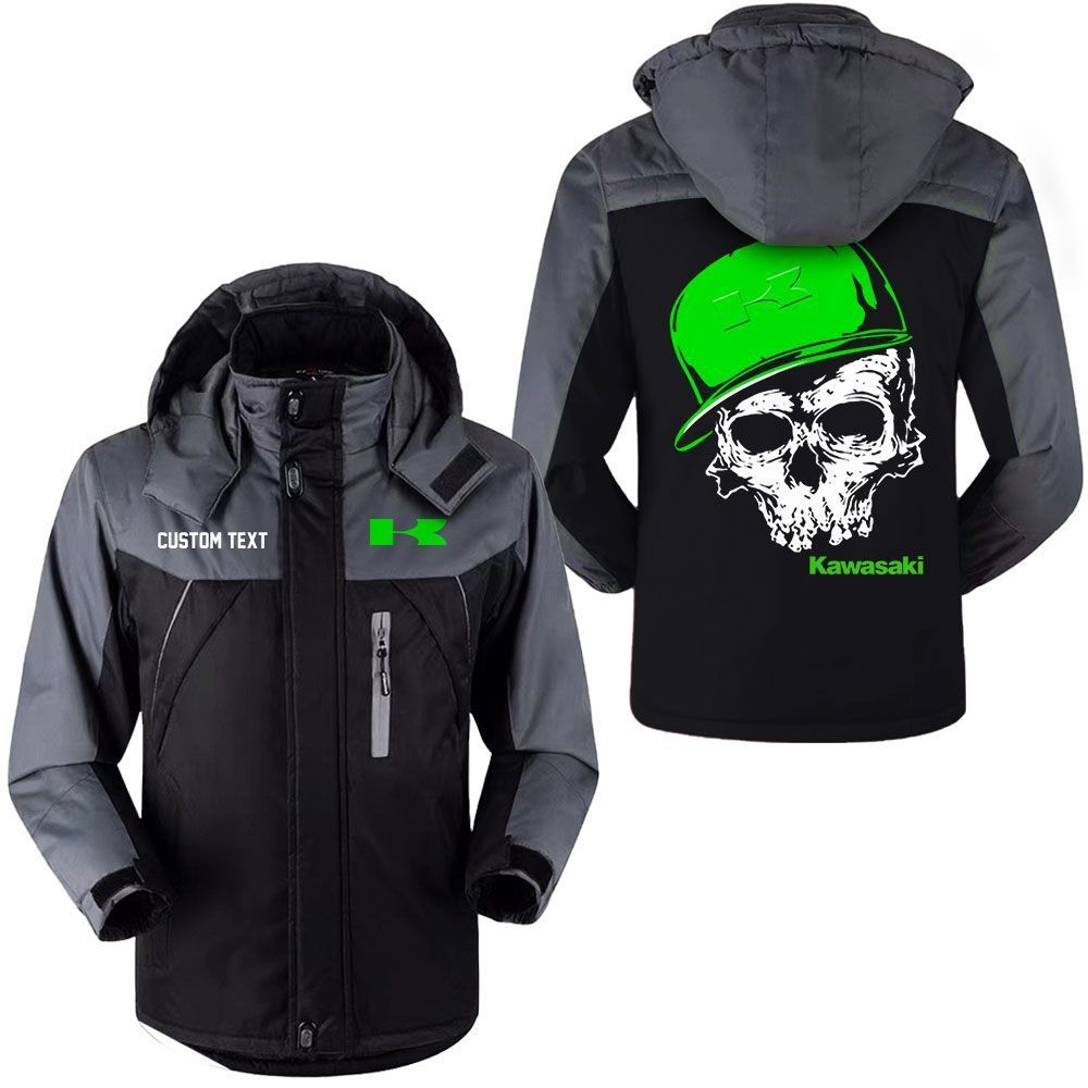 Kawasaki Logo Custom Name Skull Design Hooded Windbreaker Ski Jacket