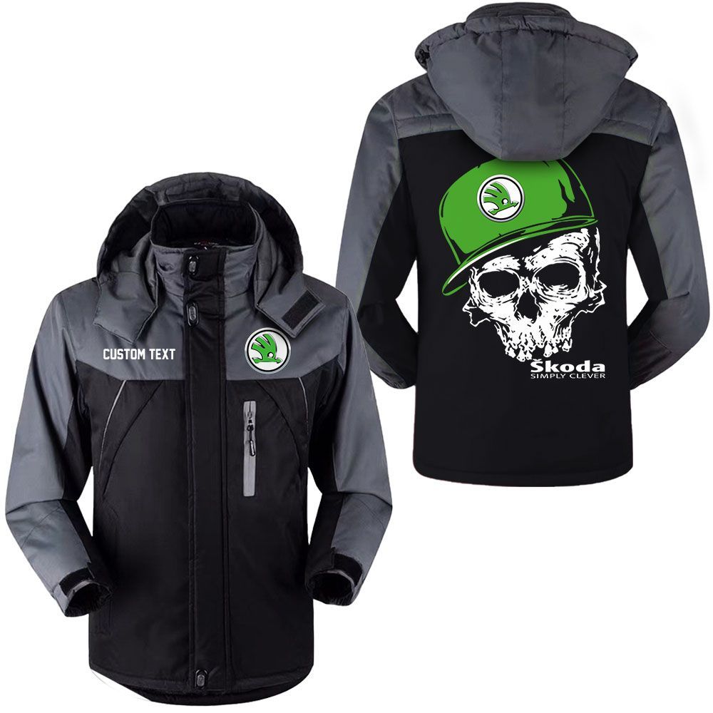 Skoda Logo Custom Name Skull Design Hooded Windbreaker Ski Jacket