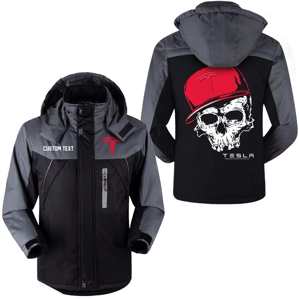 Tesla Motors Logo Custom Name Skull Design Hooded Windbreaker Ski Jacket