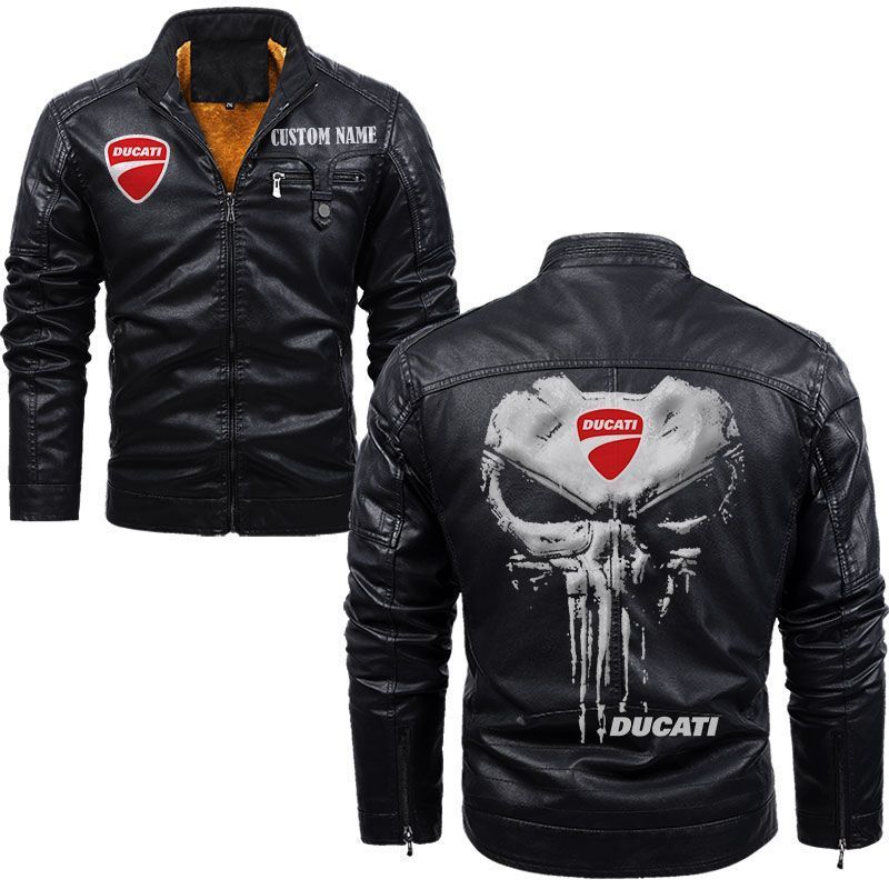 Custom Name Punisher Skull Ducati Zip Pocket Fleece Leather Jacket