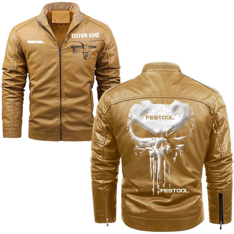 Custom Name Punisher Skull Festool Zip Pocket Fleece Leather Jacket