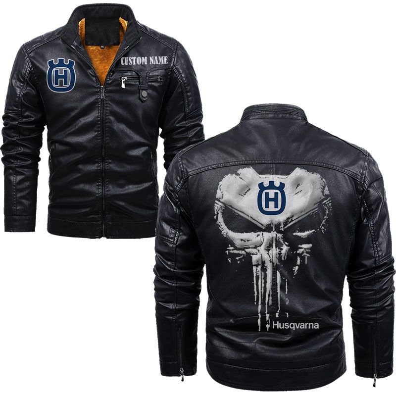 Custom Name Punisher Skull Husqvarna Zip Pocket Fleece Leather Jacket