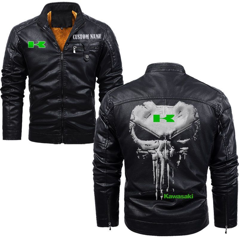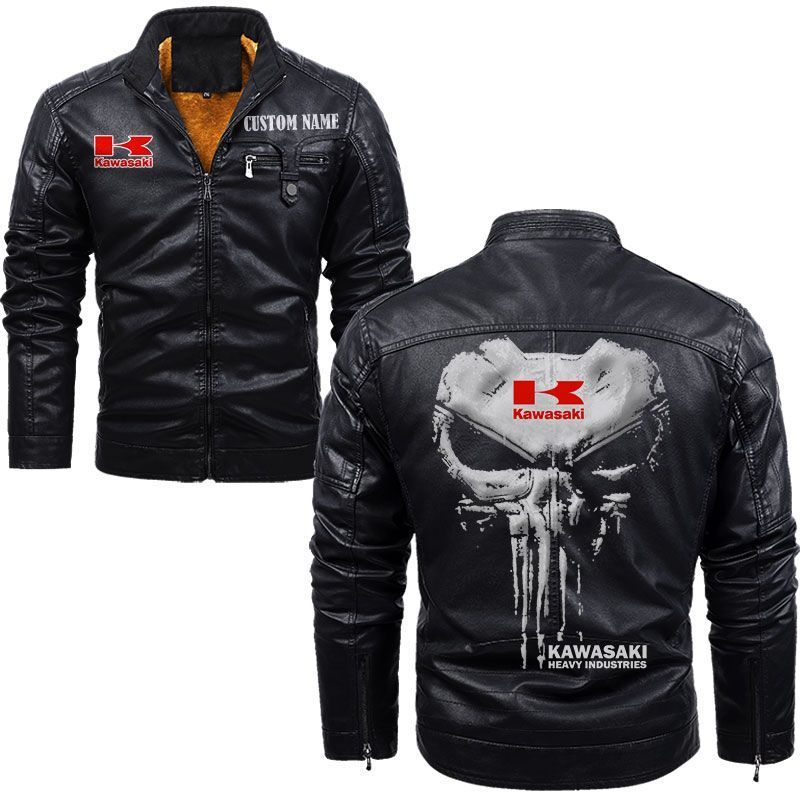 Custom Name Punisher Skull Kawasaki Heavy Industries Zip Pocket Fleece Leather Jacket