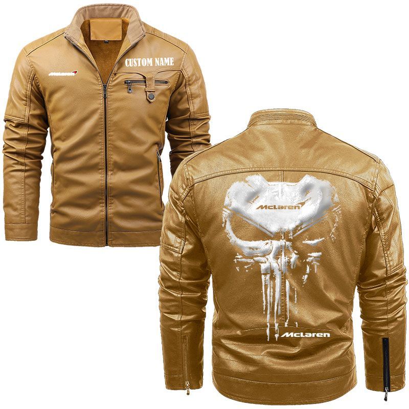 Custom Name Punisher Skull McLaren Automotive Zip Pocket Fleece Leather Jacket