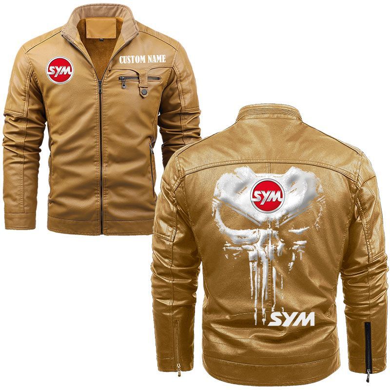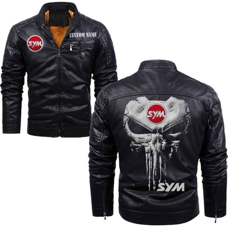Custom Name Punisher Skull SYM Motors Zip Pocket Fleece Leather Jacket