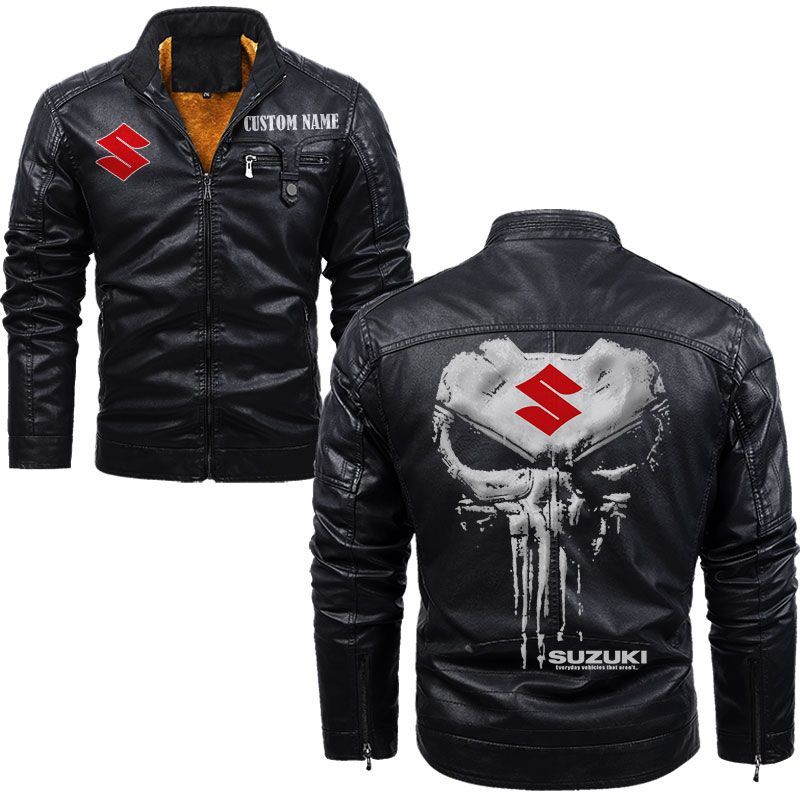 Custom Name Punisher Skull Suzuki Zip Pocket Fleece Leather Jacket