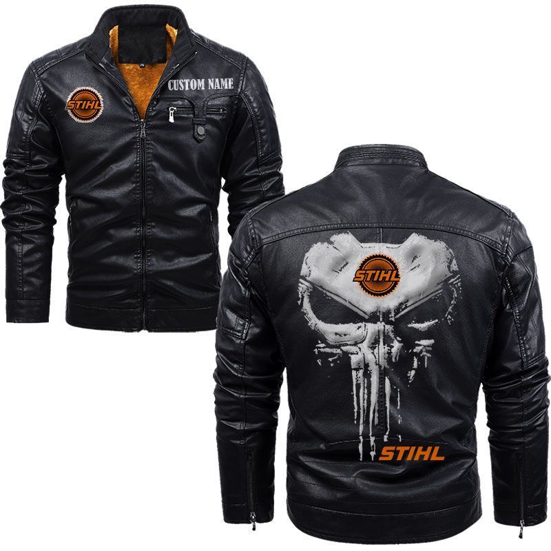 Custom Name Punisher Skull Stihl Zip Pocket Fleece Leather Jacket
