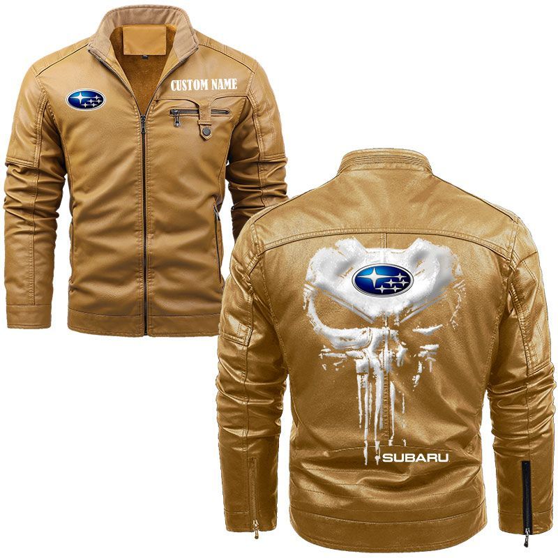 Custom Name Punisher Skull Subaru Zip Pocket Fleece Leather Jacket