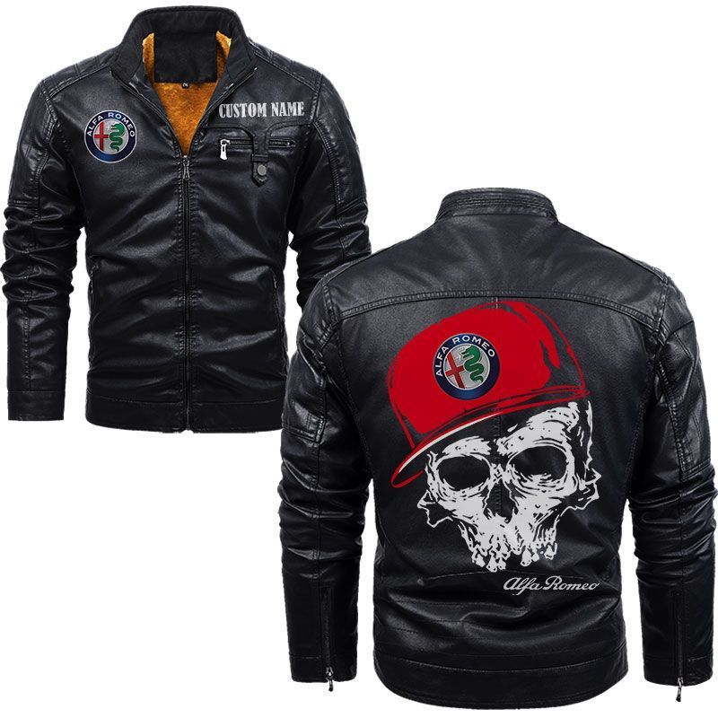 Custom Name Skull Design Alfa Romeo Zip Pocket Fleece Leather Jacket