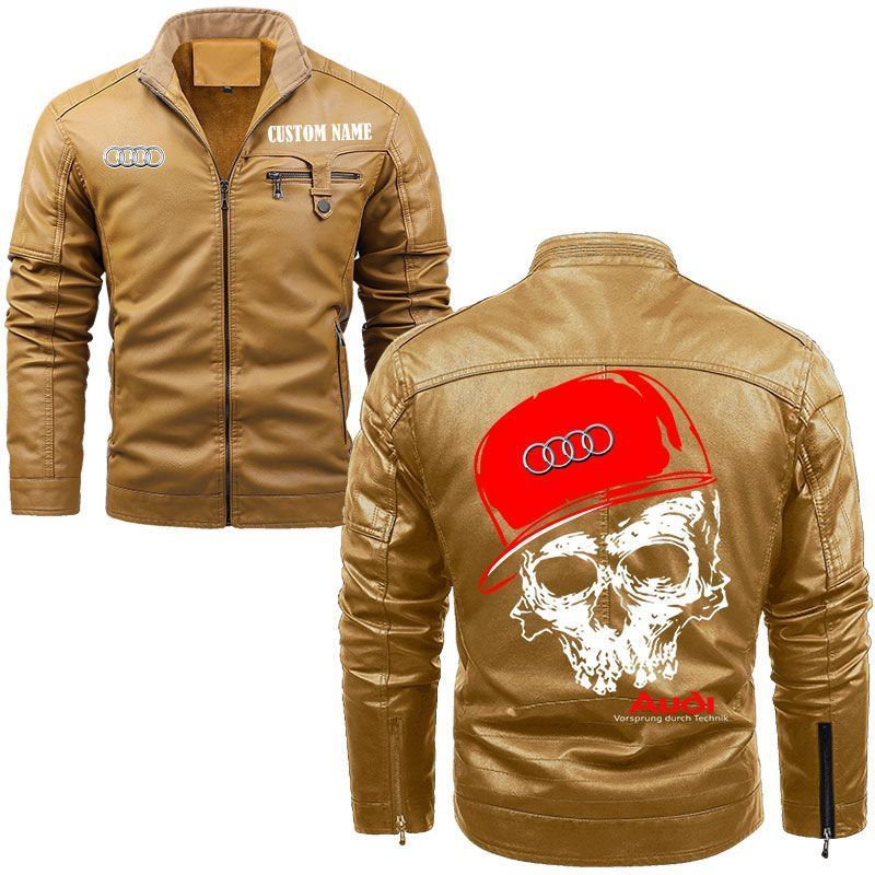 Custom Name Skull Design Audi-logo Zip Pocket Fleece Leather Jacket