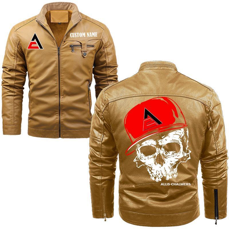 Custom Name Skull Design Allis Chalmers Zip Pocket Fleece Leather Jacket