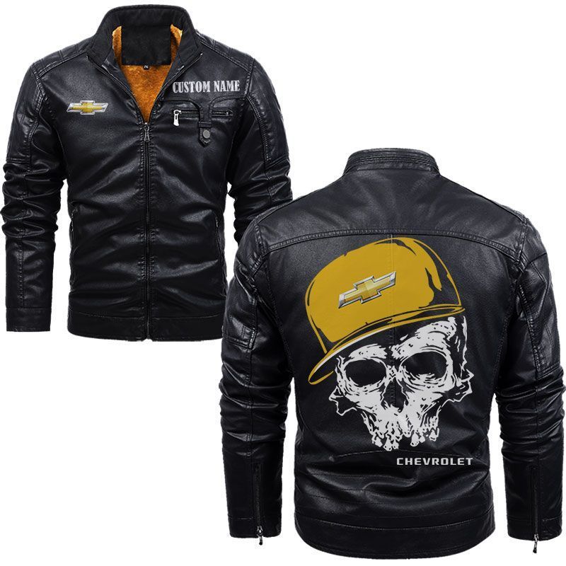 Custom Name Skull Design Chevrolet Zip Pocket Fleece Leather Jacket