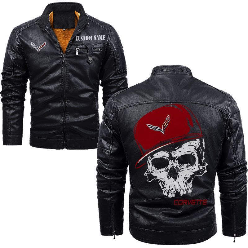 Custom Name Skull Design Chevrolet Corvette Zip Pocket Fleece Leather Jacket