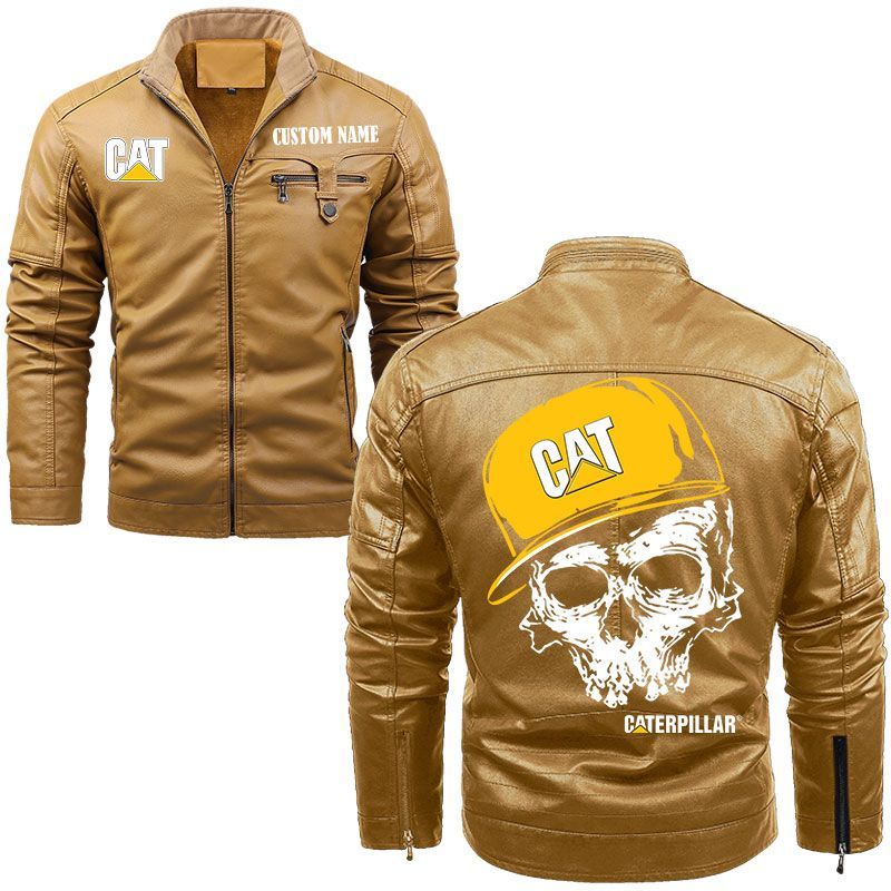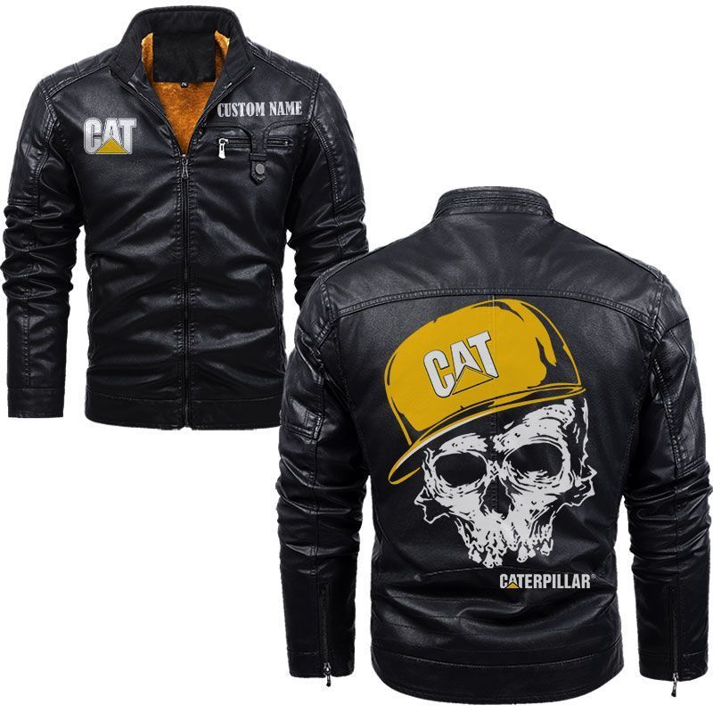 Custom Name Skull Design Caterpillar Inc Zip Pocket Fleece Leather Jacket