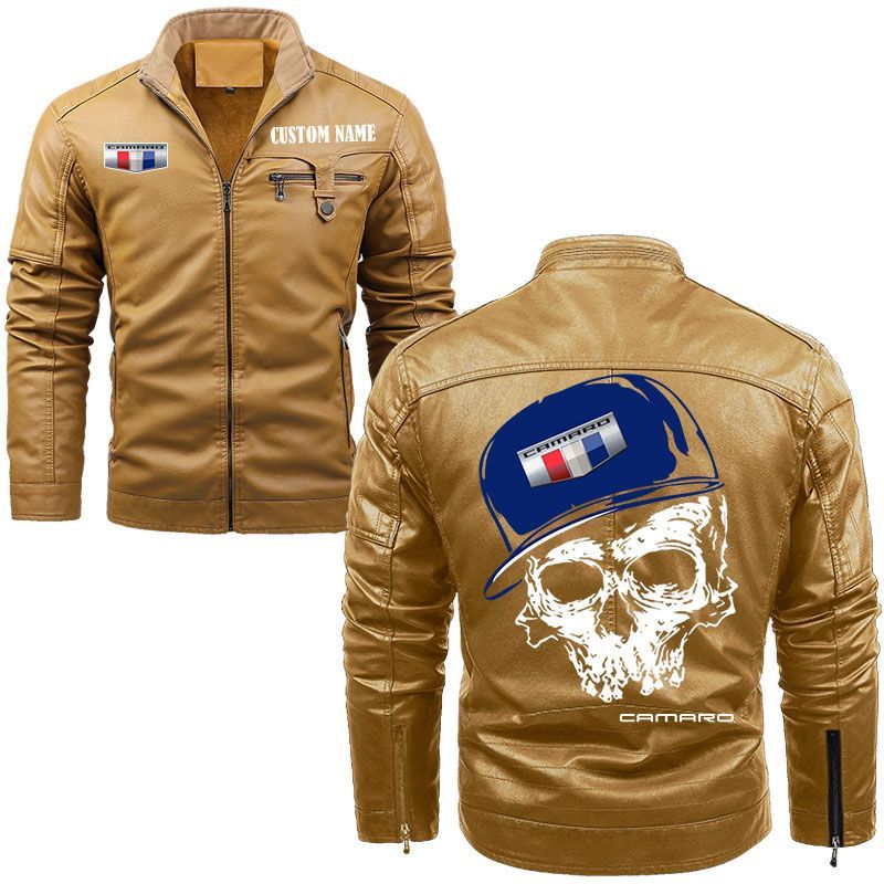 Custom Name Skull Design Chevrolet Camaro Zip Pocket Fleece Leather Jacket