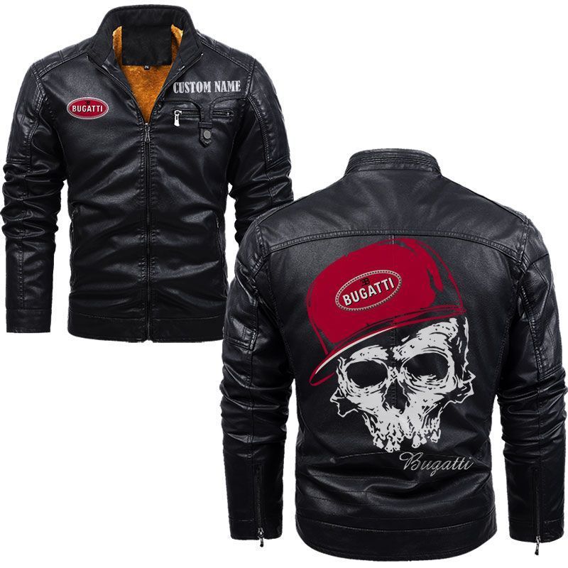 Custom Name Skull Design Bugatti Zip Pocket Fleece Leather Jacket