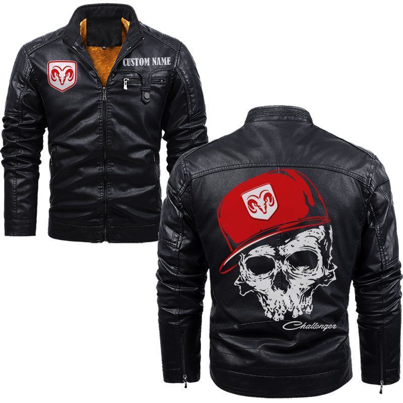 Custom Name Skull Design Dodge Challenger Zip Pocket Fleece Leather Jacket