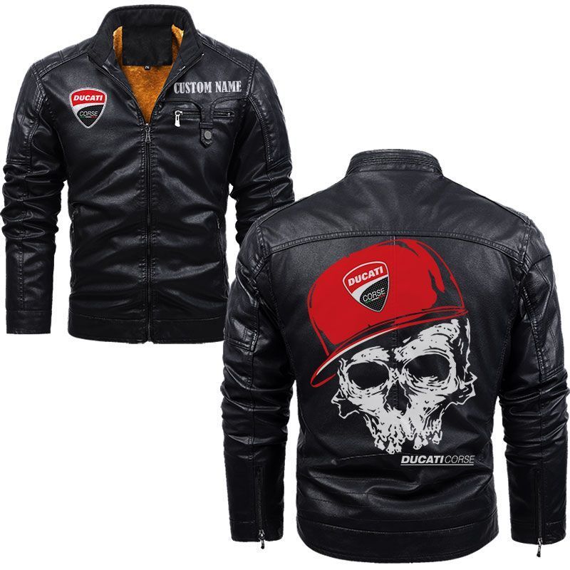 Custom Name Skull Design Ducati Corse Zip Pocket Fleece Leather Jacket
