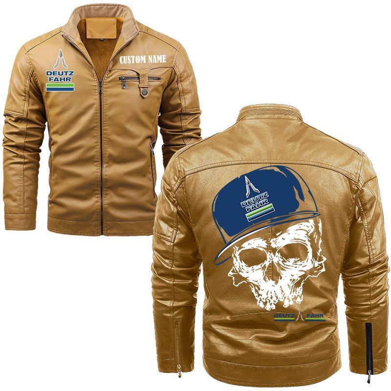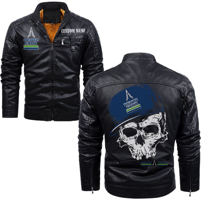 Custom Name Skull Design Deutz Fahr Zip Pocket Fleece Leather Jacket