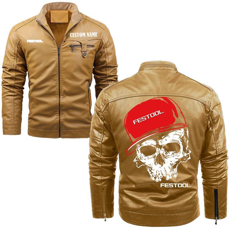 Custom Name Skull Design Festool Zip Pocket Fleece Leather Jacket