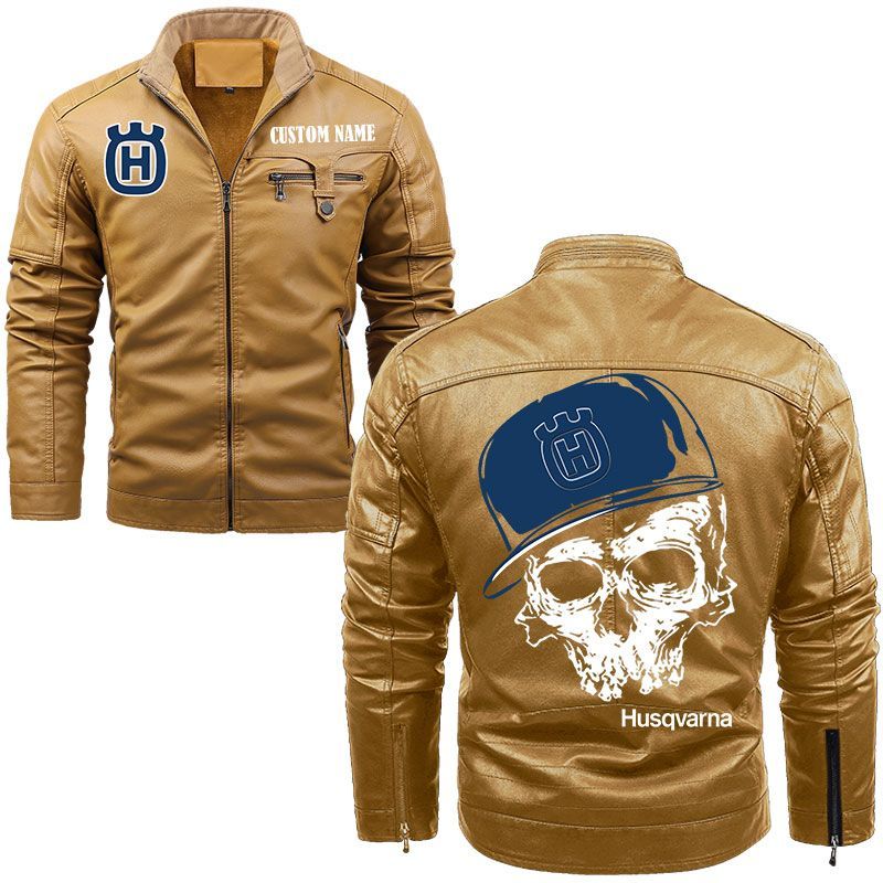 Custom Name Skull Design Husqvarna Zip Pocket Fleece Leather Jacket