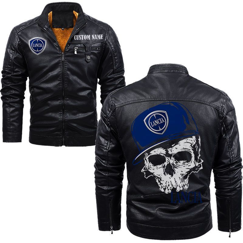 Custom Name Skull Design Lancia Zip Pocket Fleece Leather Jacket
