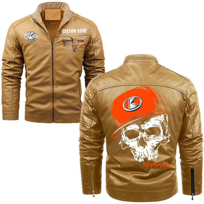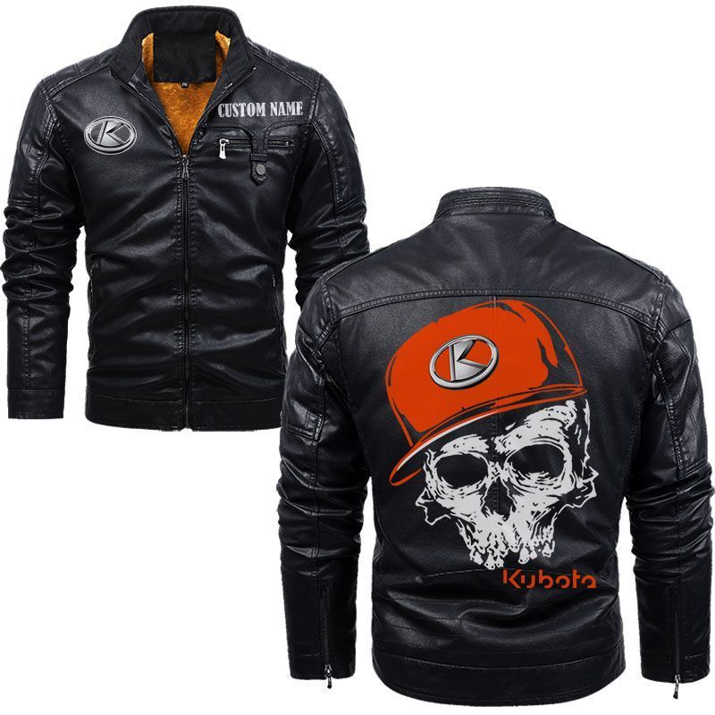 Custom Name Skull Design Kubota Zip Pocket Fleece Leather Jacket
