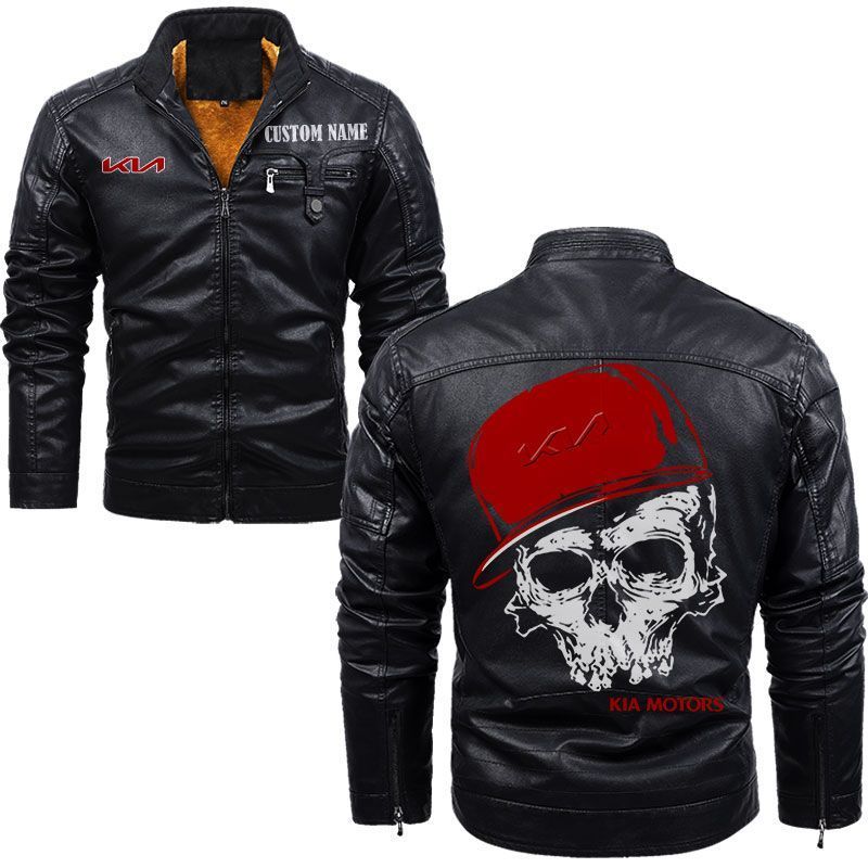 Custom Name Skull Design Kia Zip Pocket Fleece Leather Jacket