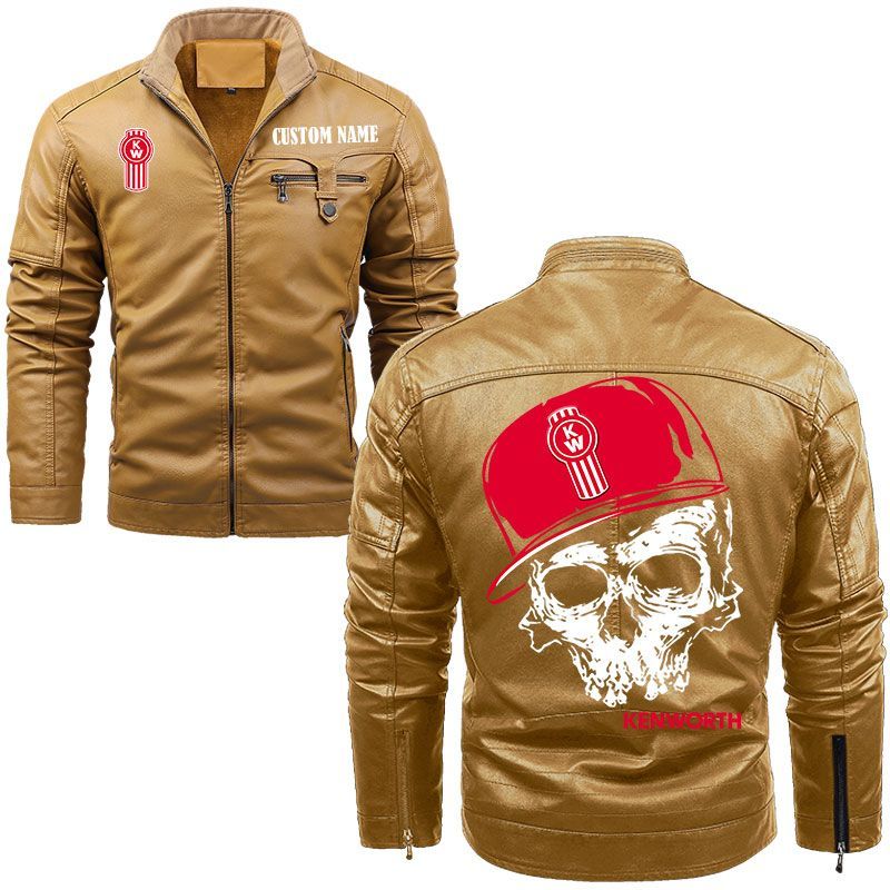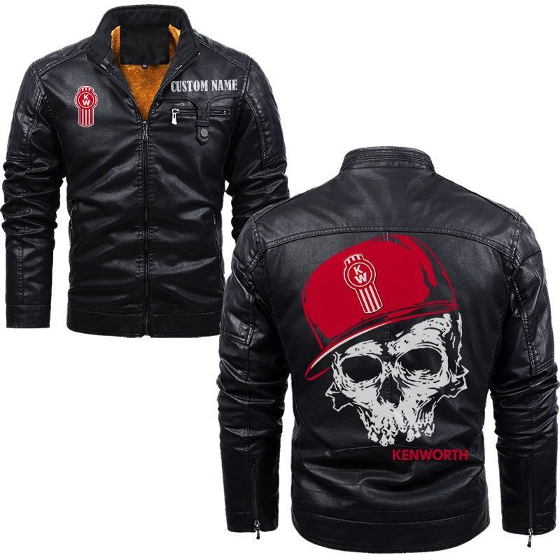 Custom Name Skull Design Kenworth Zip Pocket Fleece Leather Jacket