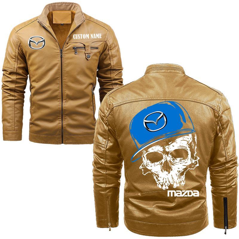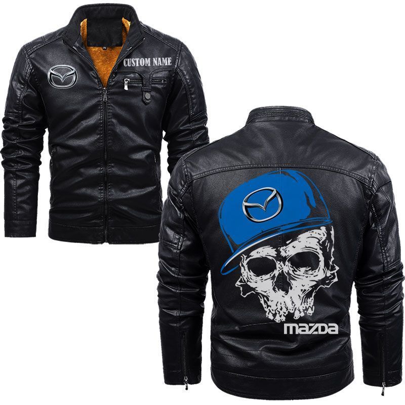 Custom Name Skull Design Mazda Zip Pocket Fleece Leather Jacket
