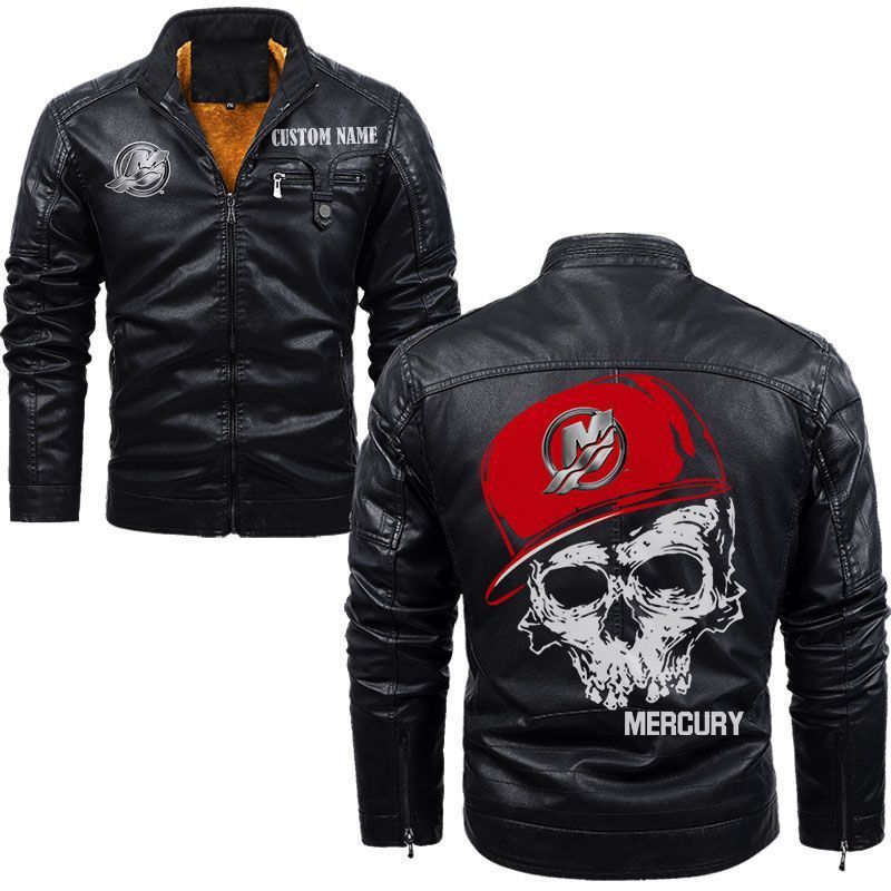 Custom Name Skull Design Mercury Marine Zip Pocket Fleece Leather Jacket