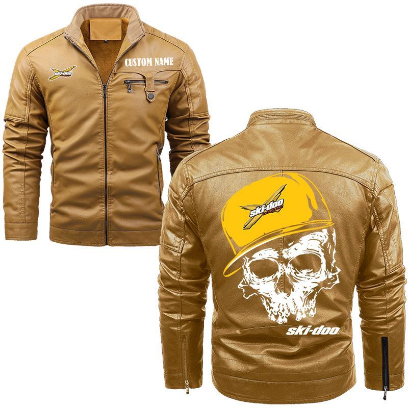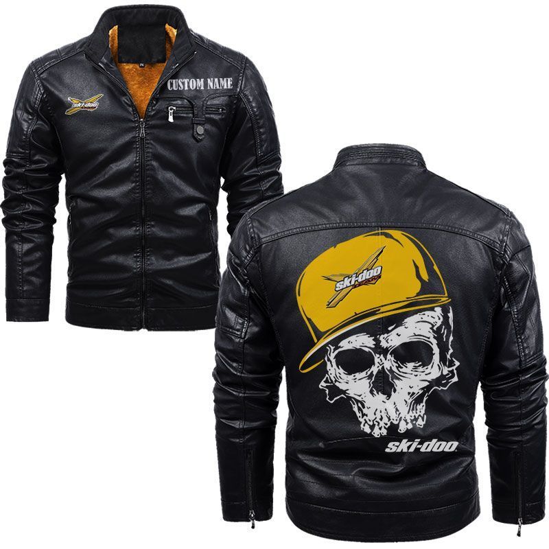 Custom Name Skull Design Ski Doo Zip Pocket Fleece Leather Jacket