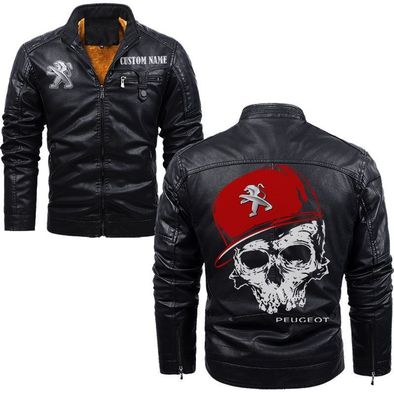 Custom Name Skull Design Peugeot Zip Pocket Fleece Leather Jacket