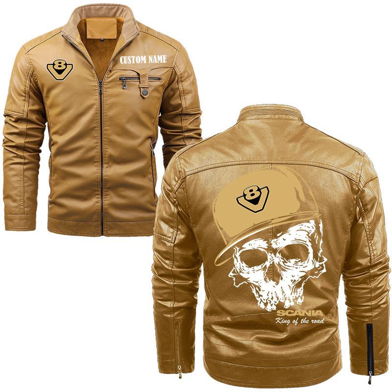 Custom Name Skull Design Scania V8 Zip Pocket Fleece Leather Jacket
