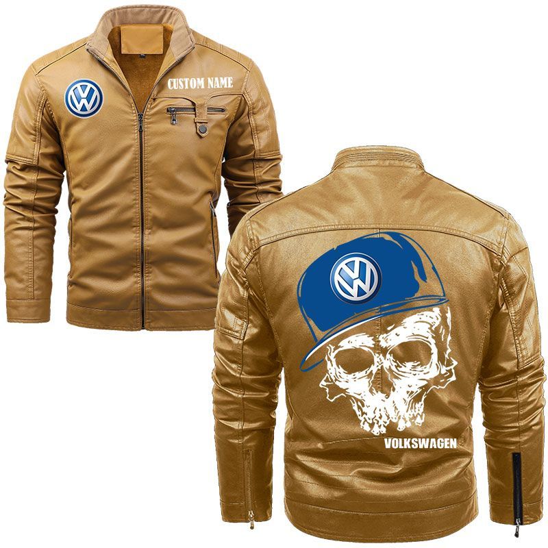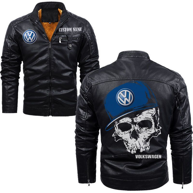 Custom Name Skull Design Volkswagen Group Zip Pocket Fleece Leather Jacket