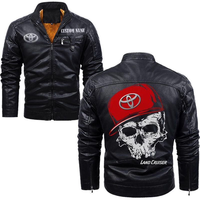 Custom Name Skull Design Toyota Land Cruiser Zip Pocket Fleece Leather Jacket