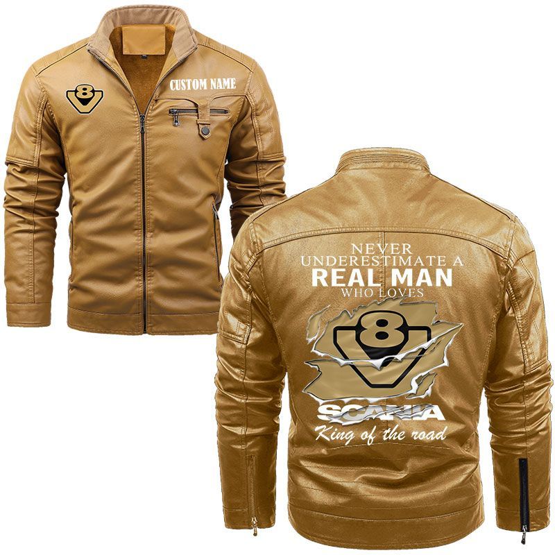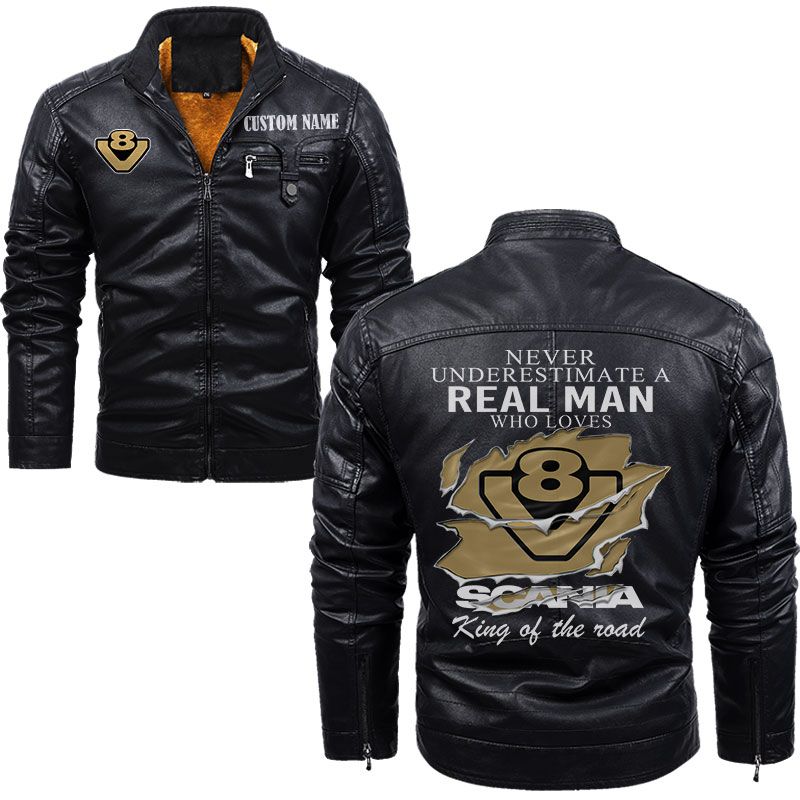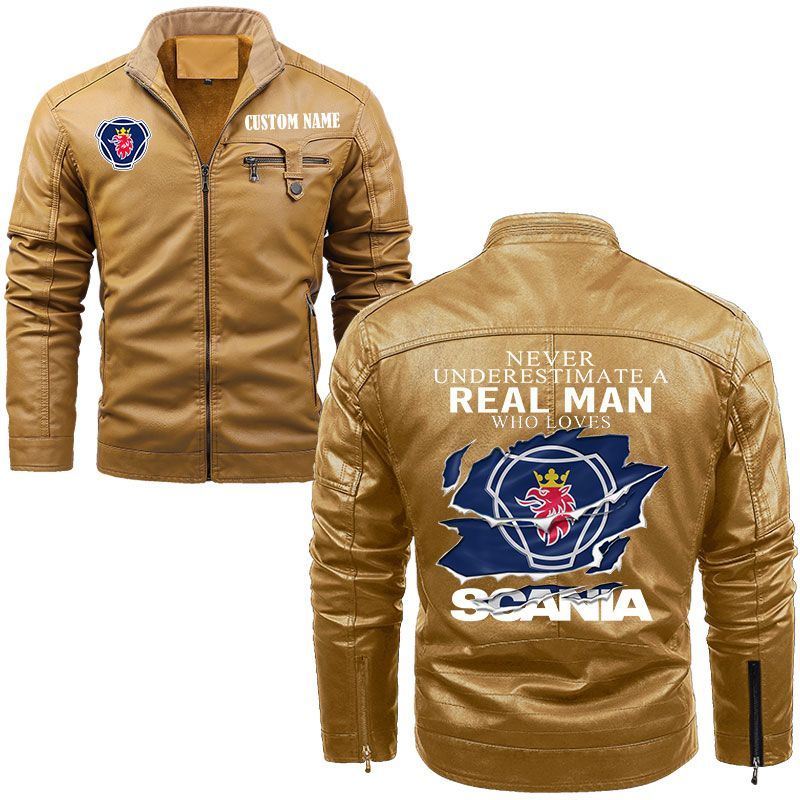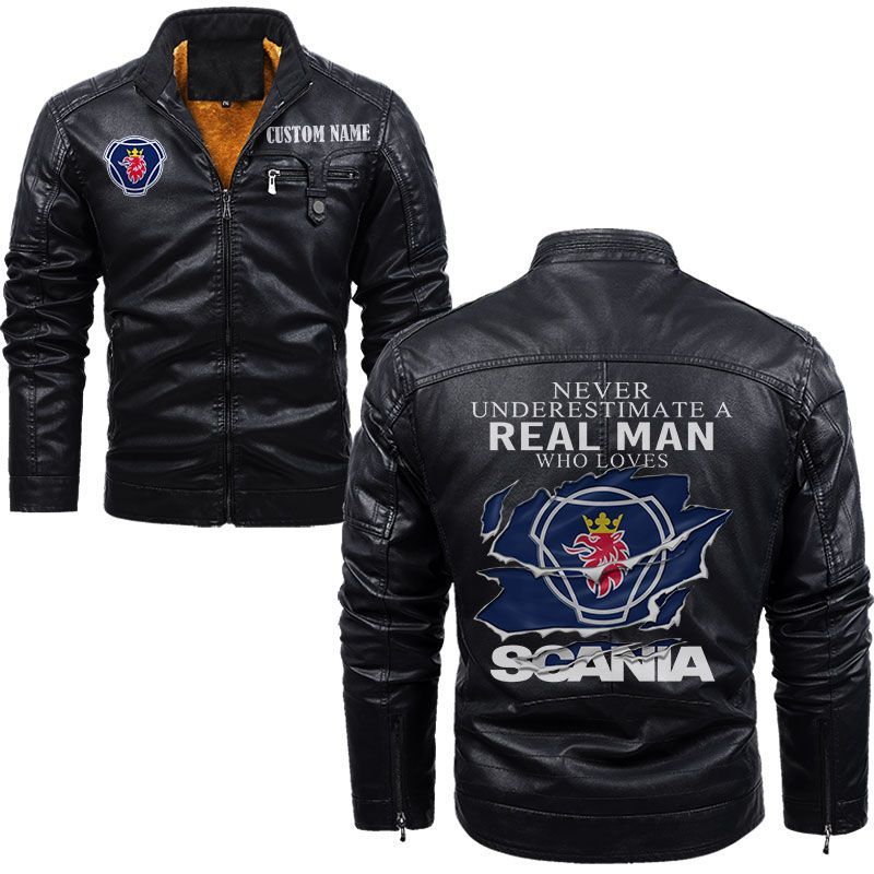 Never Underestimate A Real Man Who Loves Scania Zip Pocket Fleece Leather Jacket