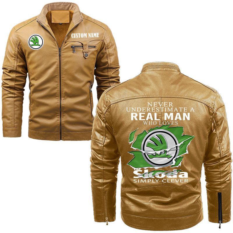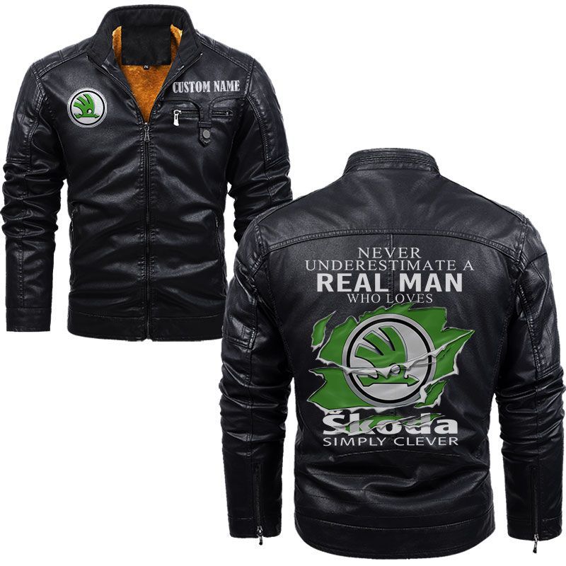 Never Underestimate A Real Man Who Loves Skoda Zip Pocket Fleece Leather Jacket