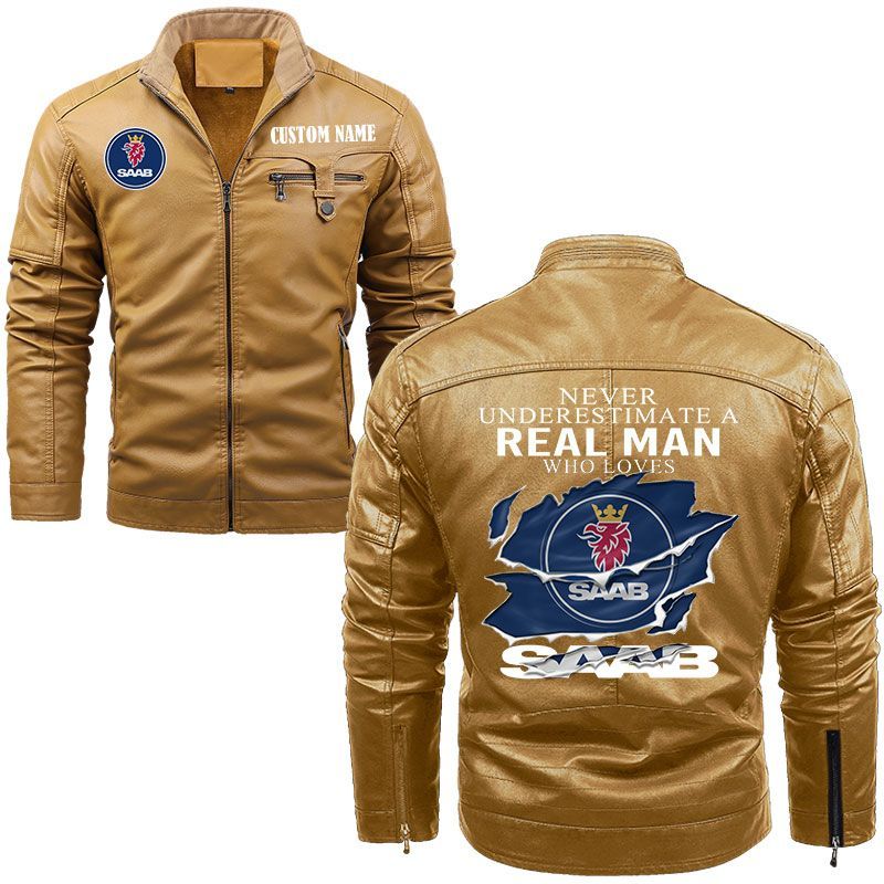 Never Underestimate A Real Man Who Loves SAAB Zip Pocket Fleece Leather Jacket