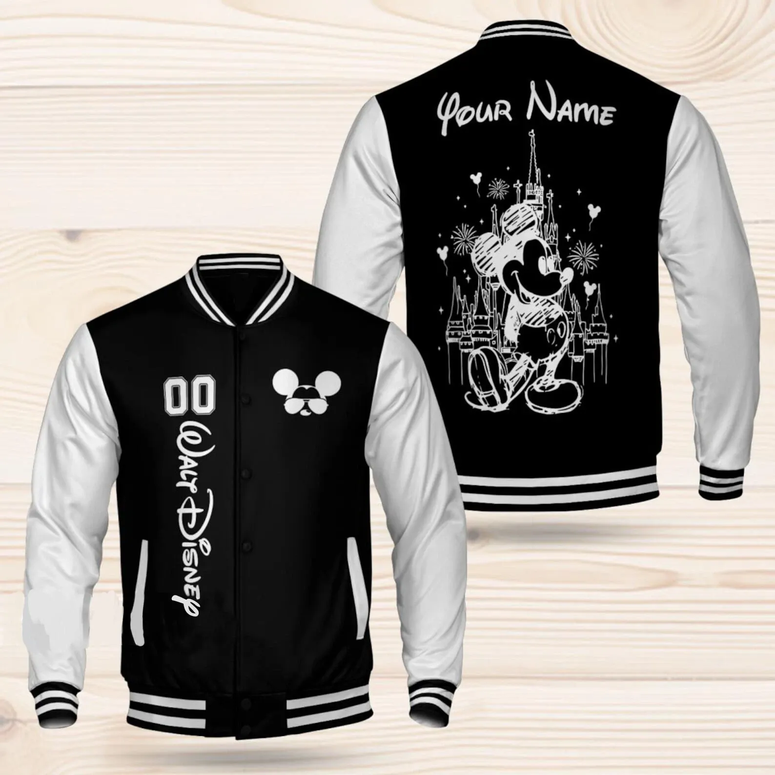 Personalized Classic Mickey Mouse Magical Castle Black & White Baseball Jacket