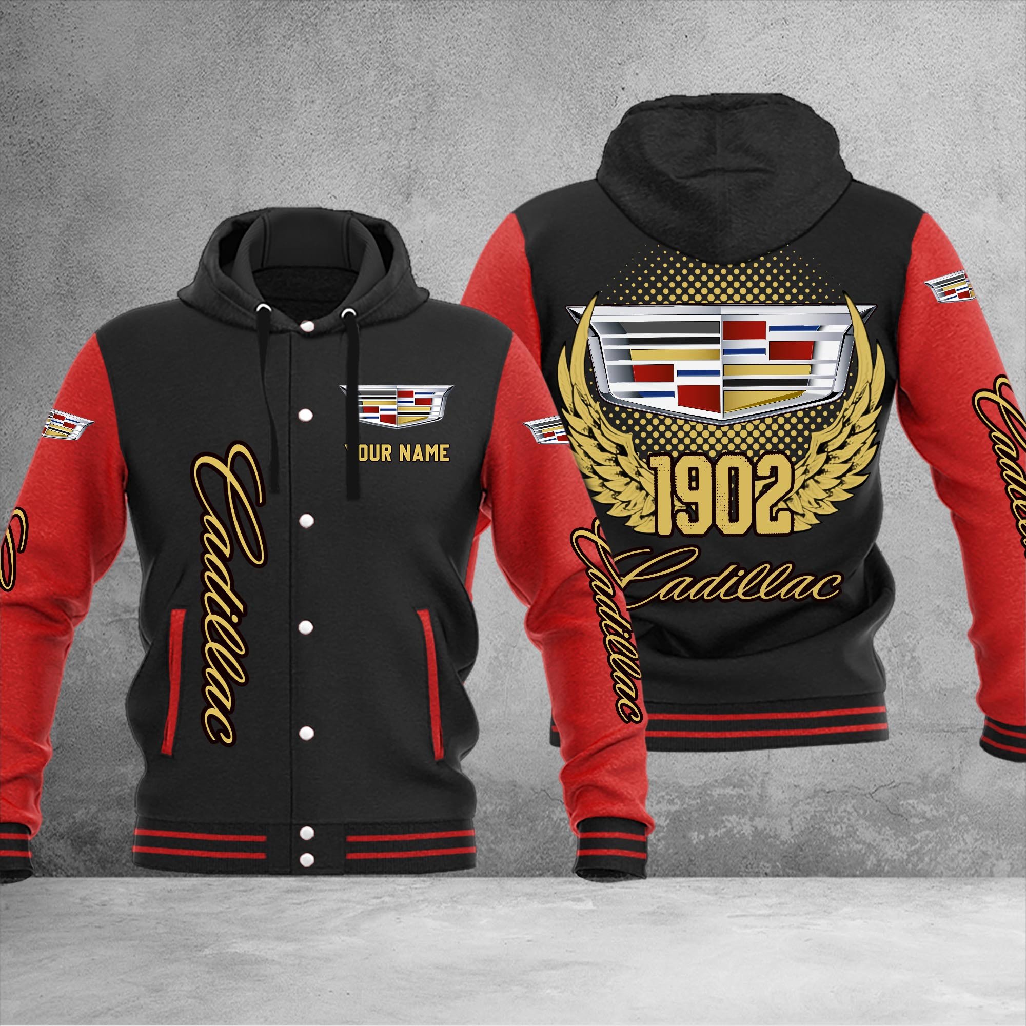 Cadillac Logo Moto Custom Hooded Baseball Jacket For Fans Red Black