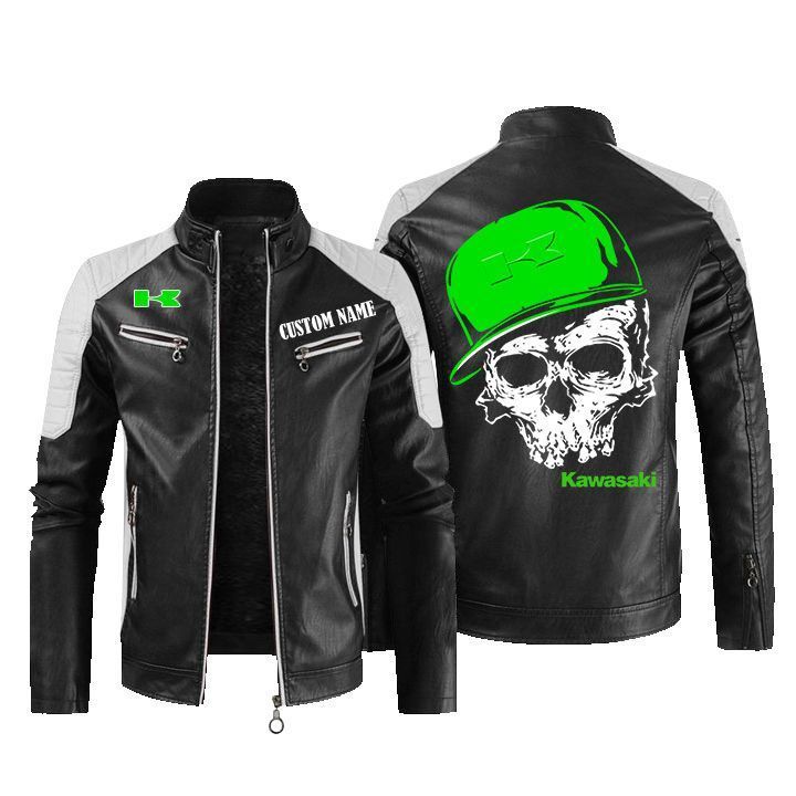 Custom Name Skull Design Kawasaki Leather Biker Jacket