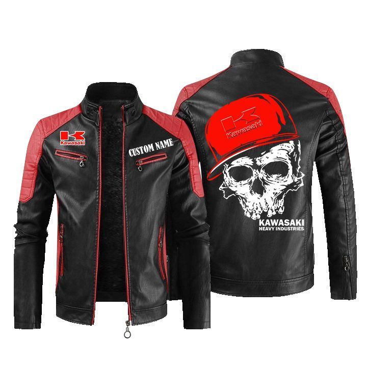 Custom Name Skull Design Kawasaki Heavy Industries Leather Biker Jacket