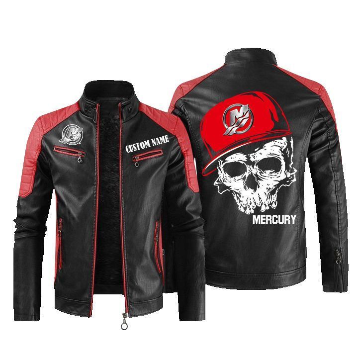 Custom Name Skull Design Mercury Marine Leather Biker Jacket