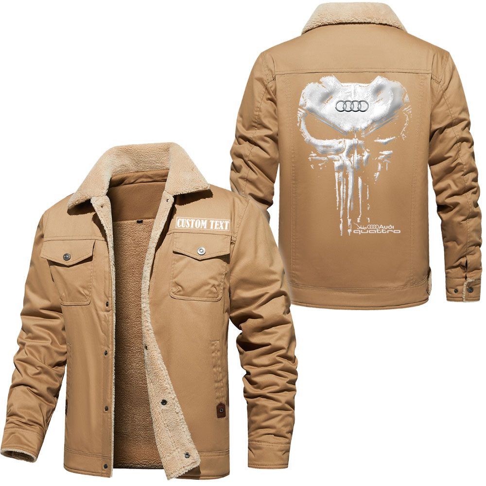 Audi Quattro Logo Custom Name Cargo Fleece Lined Cotton Jacket Personalized Outerwear with Skull Design