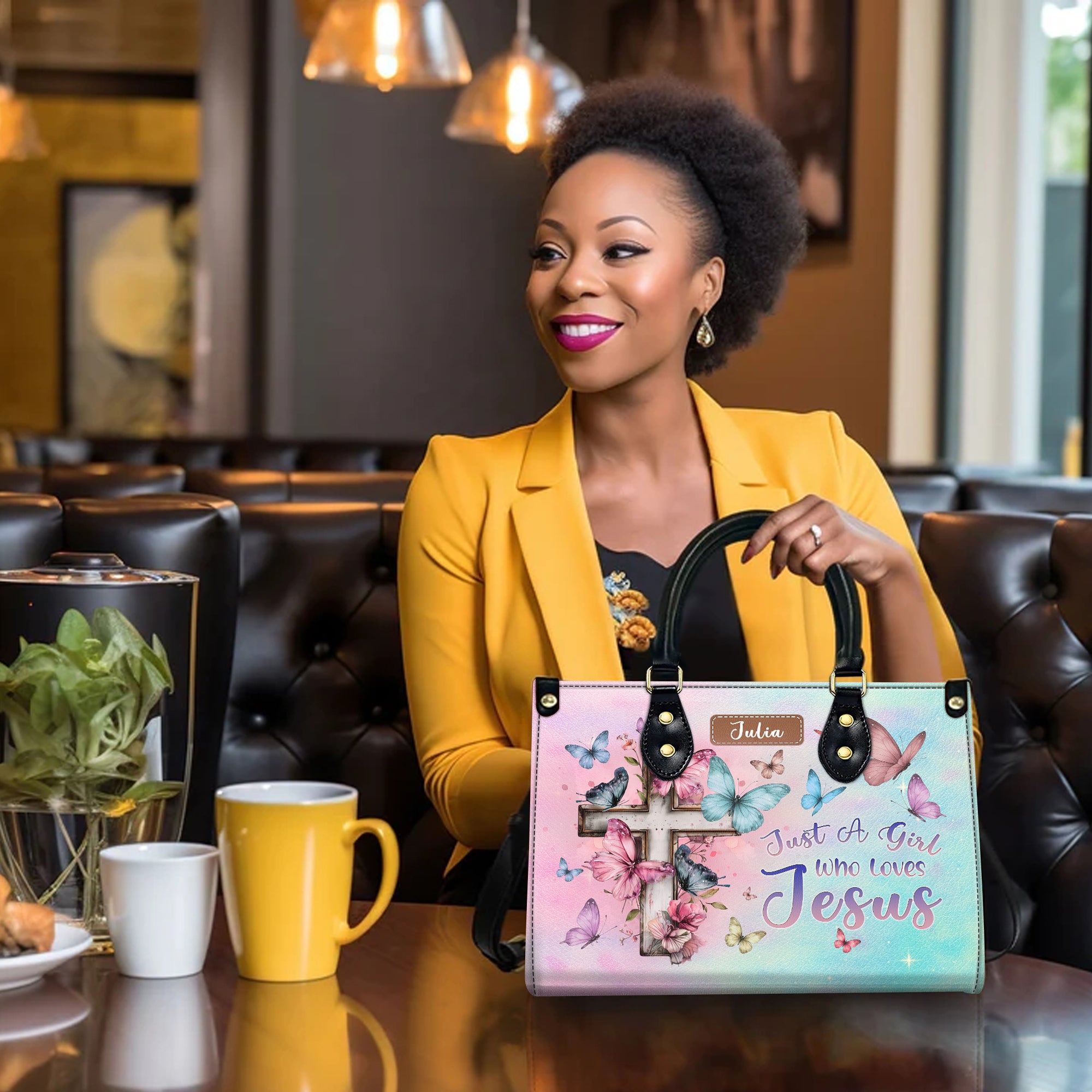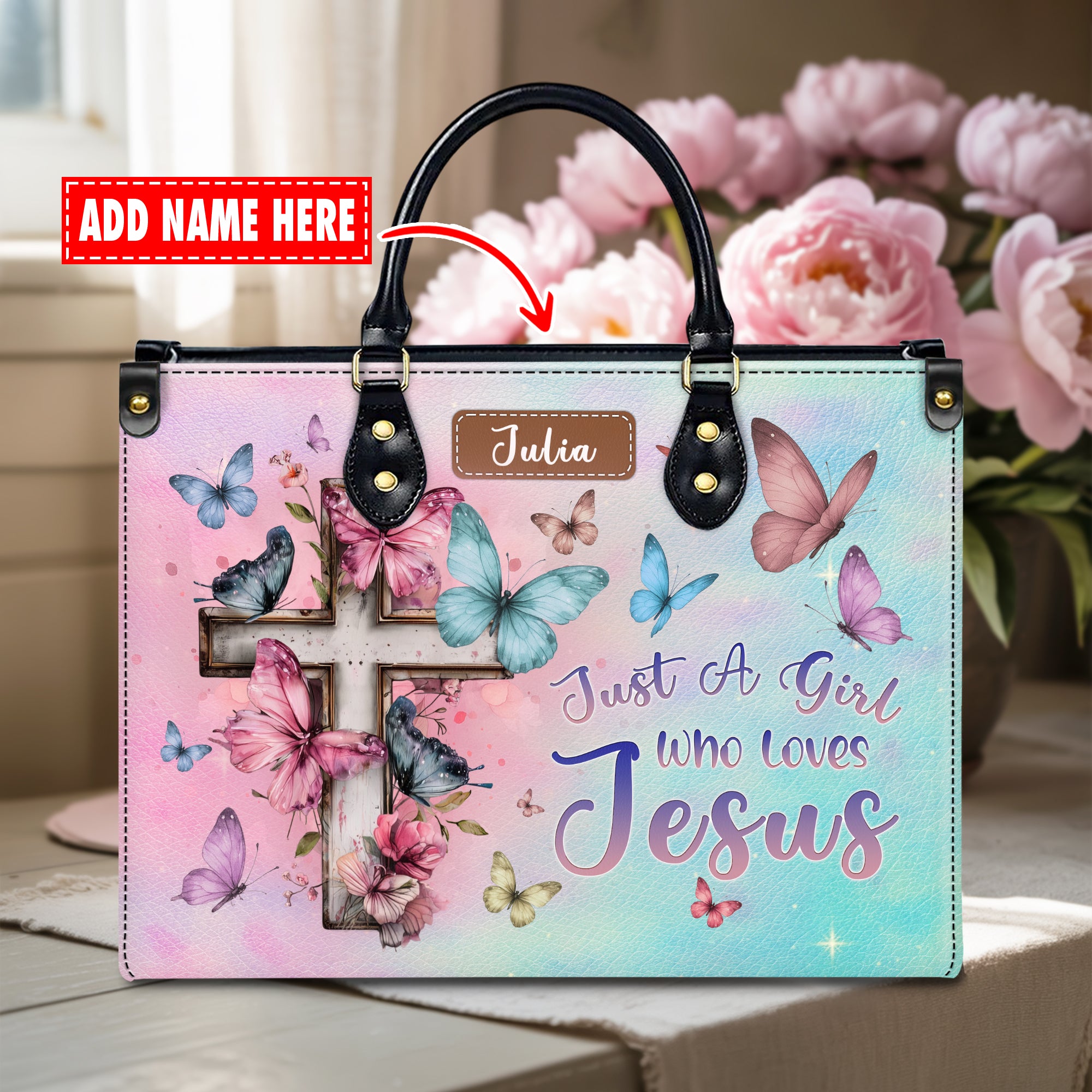 Just A Girl Who Loves Jesus Butterfly Cross Personalized Leather Handbag